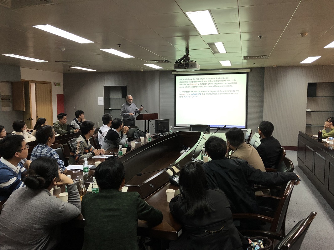 2018年11月29日上午,应多多28邀请,国际著名数学家、西班牙皇家科学院院士Jaume Llibre在我校工业中心605会议厅作了关于分片连续的平面微分动力系统最新研究进展的学术报告。报告由多多28副院长梁海华教授主持,我校十多位数学教师、二十多名研究生以及华南师范大学、暨南大学、中山大学、广州航海学院的同行参加了本次报告。