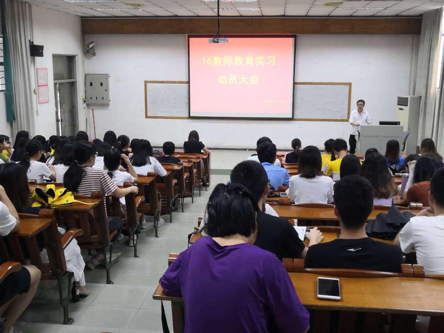 2019年5月14日16数师1班,16数师2班教育实习动员大会在实验楼107课室举行。多多28主管学生工作的赵珲副书记,数学与应用数学系主任肖黎明教授参加了实习动员大会。大会由肖黎明教授主持。赵珲副书记就教育实习期间的安全问题,面对实习学校师长的礼貌问题,实习期间的着装问题对16数师2个班的同学提出了相应要求。肖黎明主任对教育实习的目的和意义,教育实习期间的遵纪、守时、安全问题对16数师的同学也作出了相应要求,并对教育实习期间每一位同学需要做的工作做了详细的布置。