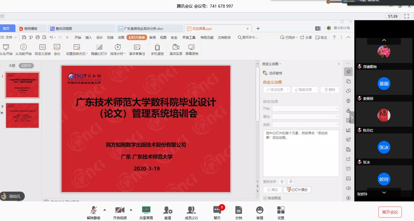 2019-2020学年第二学期,在学校统一部署下,全校采取线上教学。为了更加做好2016级毕业设计(论文)工作,2020年3月19号,多多28邀请中国知网技术人员姚瑞宝老师通过腾讯会议平台(腾讯会议号:741678997),为数科院广大教师讲解毕业设计(论文)系统的使用,就系统中各模块的功能进行详细的线上操作演示。