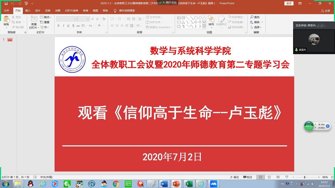 7月2日下午,多多28党总支召开2020年师德教育第二专题学习会,以视频会议的形式,组织全体教师学习观看《信仰高于生命--卢玉彪》。
