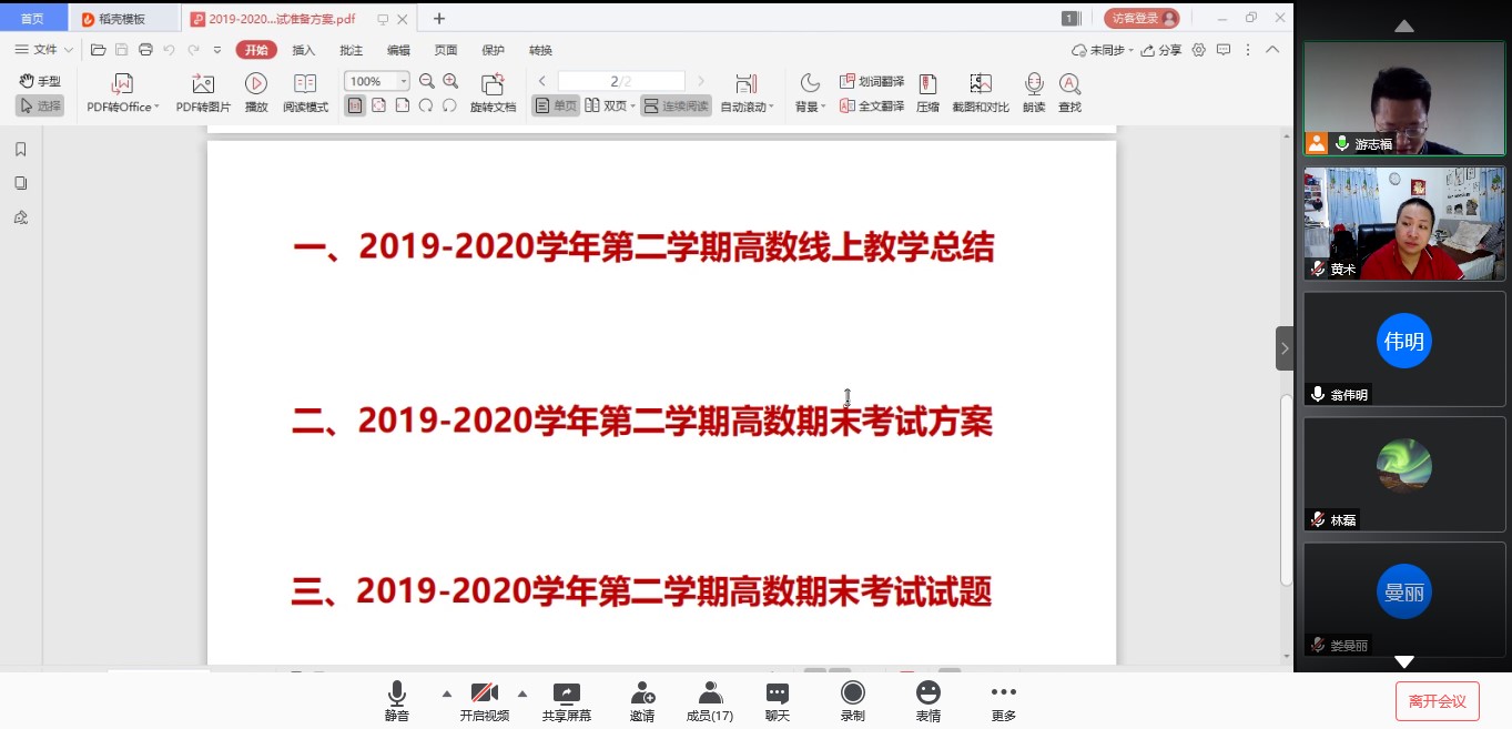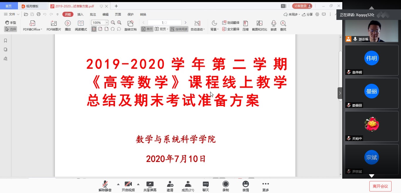 2020年7月10日,多多28高等数学部在腾讯会议,召开了2019-2020学年第二学期《高等数学》课程线上教学总结及期末考试准备方案会议。