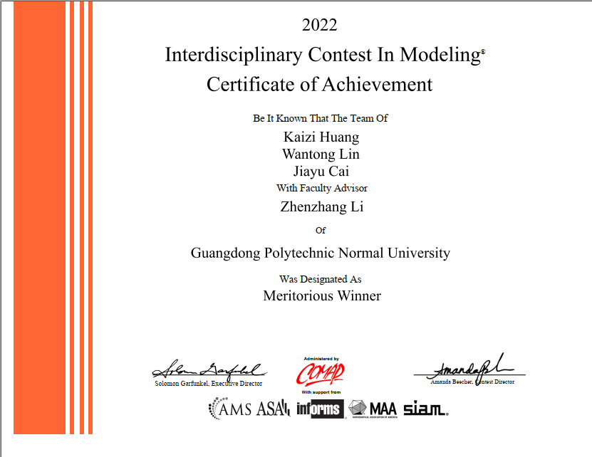 美国大学生数学建模竞赛始于1985年,是由美国数学学会、美国工业与应用数学学会举办的国际性大学生数学建模竞赛,因其极具挑战性和公平性,越来越受到国内外著名高校学子的欢迎。该项活动旨在激励学生学习数学的积极性,提高学生建立数学模型和运用计算机技术解决实际问题的综合能力,培养学生创新和合作精神,开拓知识面,是目前国际上规模最大的大学生课外科技创新活动之一。