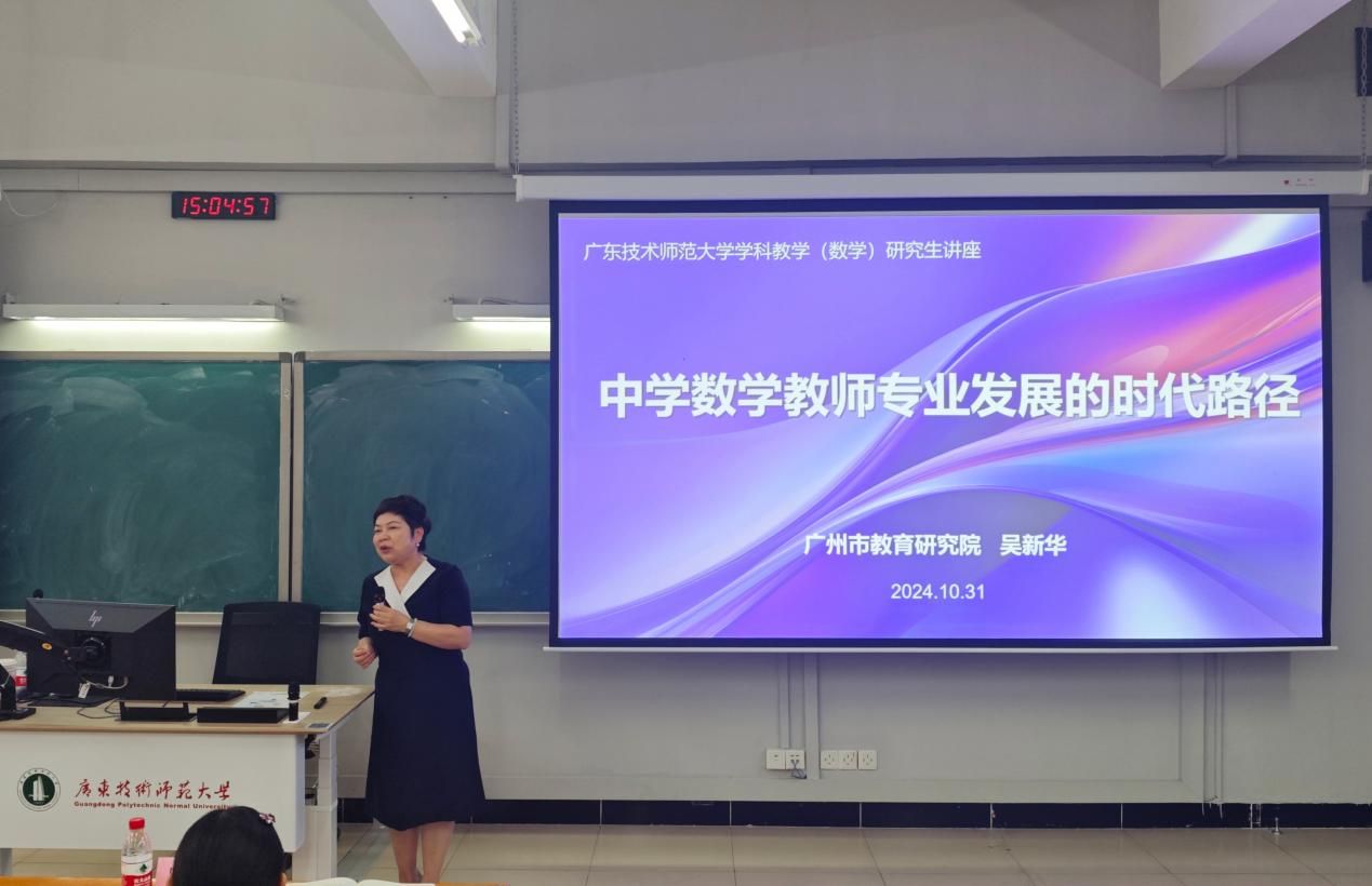 10月31日下午,我院邀请了广州市教育研究院吴新华副院长、华南师范大学苏洪雨教授到我校白云校区三教209室作专业学术报告。我院梁海华院长、陈月红副院长、杜康主任以及2024级、2023级学科教学(数学)全体研究生、2022级本科卓越班全体学生参加了会议,会议由梁海华院长主持。