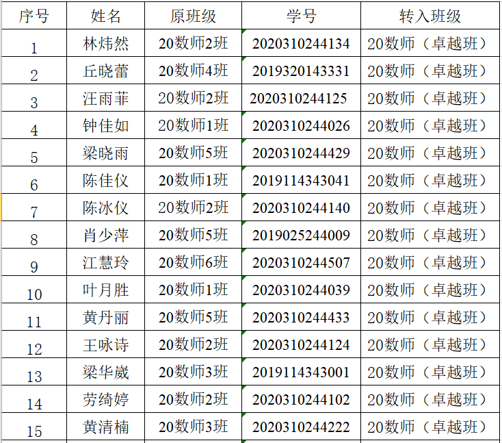 根据《数学与应用数学专业卓越教师班招生简章》工作方案,经学生个人报名、学院组织笔试、面试,按综合成绩排名,择优录取30名同学进入2020数学与应用数学师范(卓越)班,现将名单予以公示。