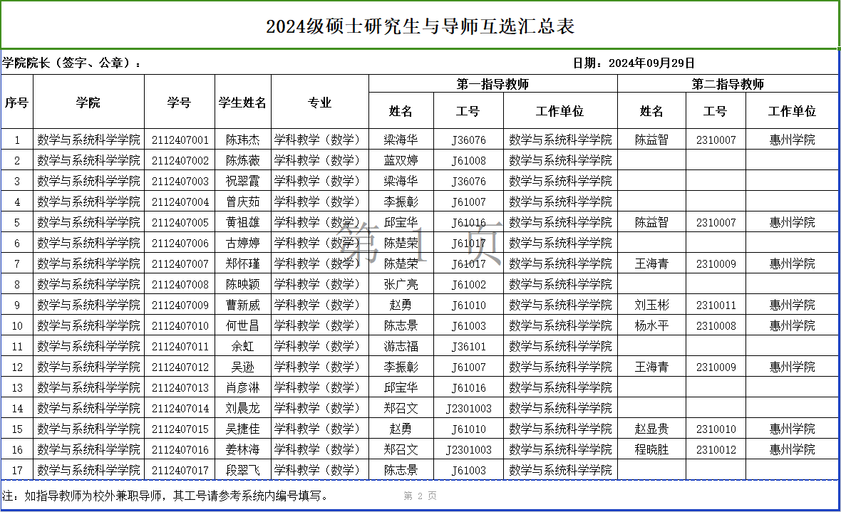 根据《关于做好2024级硕士研究生与导师互选工作的通知》(广师大研〔2024〕62号)文件要求,我院于本着公平、公正、公开原则,于2024年9月29日顺利完成硕士研究生师生互选工作。现将名单予以公示: