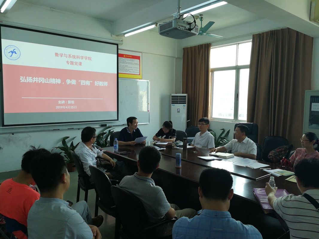 2019年4月25日下午,在校本部一教1211室,多多28教工第一党支部召开全体党员会议。会议内容:彭雪书记以《弘扬井冈山精神,争做“四有”好老师》为题,给党员上专题党课。