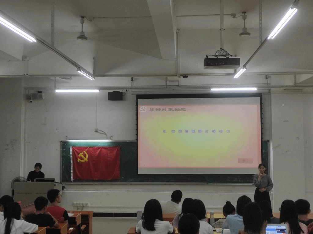 首先,全体党员奏唱国歌,主持人宣读答辩程序。然后,由6位预备党员按照抽签顺序上台答辩,分别进行自我介绍、回答政治理论题、分析时事热点、回答评委提问、评委点评五个环节。在答辩过程中,6位预备党员分别展现了各自扎实的政治理论基础和良好的政治素养。最终经过民主投票,6位预备党员成功按期转正。(多多28学生党支部)
