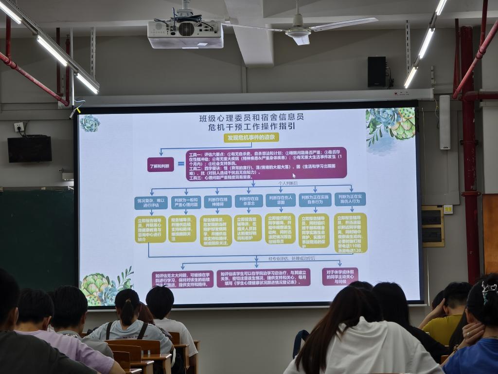 会议伊始,学校心理中心的老师详细介绍了一些常见的心理危机事件、易发生心理危机的重要时间节点以及心理危机信号,强调心理委员应时刻保持警觉,密切关注身边同学的心理状态,对可能发生的心理危机事件进行早期识别与干预。随后,老师重点介绍了一些心理评估工具,帮助心理委员更准确地了解同学们的心理状况,为后续的心理健康教育工作提供科学依据。最后,心理中心的老师对心理委员的工作流程进行了梳理和总结,介绍了心理危机干预的流程并强调学校对心理委员十个“一”的要求,希望心理委员能积极完成工作要求,协助学院开展心理健康教育工作。
